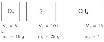 Três recipientes de volumes fixos contêm, cada um, uma substância pura no estado gasoso. Os gases estão armazenados nas mesmas condições de temperatura e pressão e os recipientes estão representados no esquema a seguir.