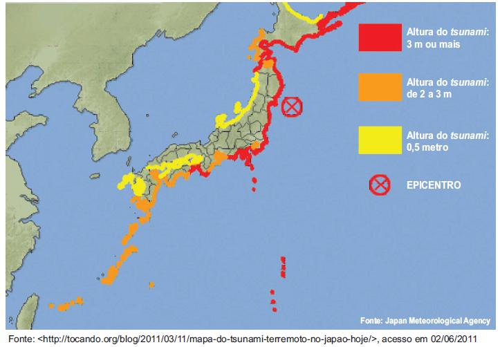 O mapa mostra a extensão e as dimensões do tsunami que atingiu o Japão recentemente. Tendo em conta esse evento e suas características naturais, pode ser dito que