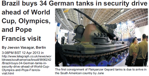 Brazil is buying 34 German anti-aircraft tanks as it beefs up security ahead of hosting the World Cup, the 2016 Olympic Games, and a papal visit. The first consignment of Flakpanzer Gepard tanks is due to arrive in the South American country by June. The armour, which has been phased out by the German military in favour of missile systems, is equipped with two 35mm guns. Brazil is strengthening internal security and counter-terrorism measures ahead of the World Cup next year and the Olympic Games in 2016. Ahead of the sporting events, Pope Francis, the first Latin American head of the Catholic church, is due to visit Rio de Janeiro in July. He will say mass at Copacabana beach, pray at the Christ the Redeemer statue, and attend a Catholic youth festival. The Brazilian army officer in command of anti-aircraft artillery, General Marcio Heise, told the G1 news service that the first eight Gepards would arrive in June. They will be deployed in the Brazilian capital, Brasilia, where the Confederations Cup - a prelude to the World Cup - kicks off on June 15, and in Rio de Janeiro, where the tournament ends on June 30, and also for the papal visit. Brazil has spent little on defence in recent decades but is now seeking to modernize its armed forces. The country's defence ministry recently announced that it was purchasing surface-to-air missile and artillery batteries from Russia. Brazil is also building five submarines in partnership with France, and plans to replaces its ageing air force. The country's air force is thought to be the largest in Latin America, and its tasks include surveillance of the Amazon rainforest, to curb drug trafficking and illegal logging. Germany is one of the world's five biggest exporters of arms. Its exports make up 7 percent of the global total, according to the Stockholm International Peace Research Institute.