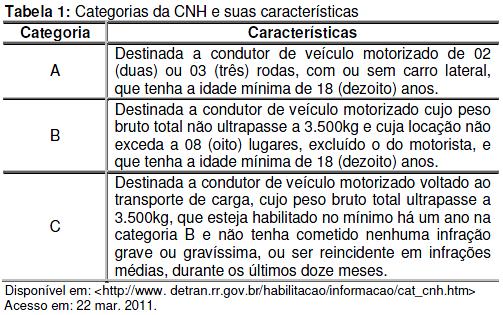 A Tabela 1 apresenta informações a respeito da Carteira Nacional de Habilitação (CNH).