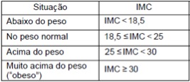 A Organização Mundial de Saúde utiliza o índice de massa corporal (IMC), que é dado pela fórmula IMC = p/h2, onde p é o peso em quilos e h é a altura em metros do indivíduo, para avaliar se o seu peso está abaixo, no normal ou acima do peso ideal. Isto é feito de acordo com a seguinte tabela: