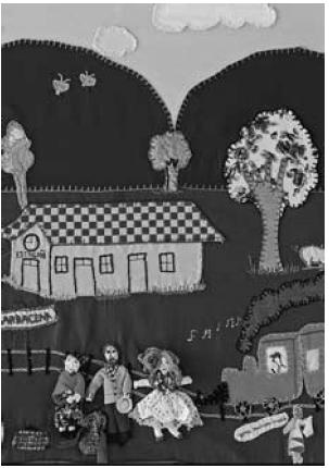 O grupo “Teia de Aranha”, a partir das obras de Guimarães Rosa, cria representações em bordado. O fragmento acima, extraído do conto “Sorôco, sua mãe, sua filha”, e o bordado, inspirado no mesmo conto,
