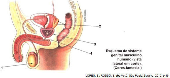 Os testículos (1) atuam como glândulas responsáveis pela produção da testosterona. As glândulas vesiculosas (2) produzem secreção fluida com nutrientes que dá volume ao sêmen ejaculado e regula o pH vaginal. A próstata (3) produz uma secreção leitosa importante na alcalinização do pH vaginal, representando aproximadamente 25% do volume do sêmen. A glândula bulbouretral (4) produz secreção mucosa para lubrificação da uretra, que representa aproximadamente 10% do volume do sêmen.