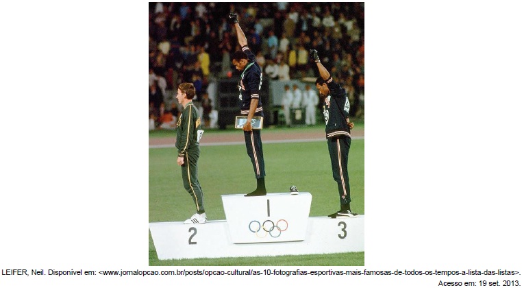 A foto reproduzida acima registra o pódio da prova dos 200 metros de atletismo nas Olimpíadas do México, em 1968. O gesto peculiar dos atletas negros norte-americanos Tommie Smith e John Carlos, abaixando a cabeça e levantando o braço para o alto, representa