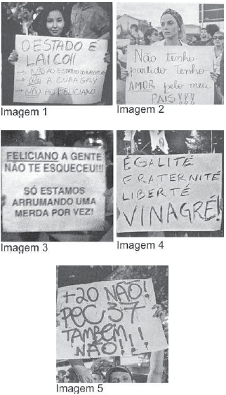 Em junho de 2013, manifestações de rua, envolvendo milhares de pessoas, ocuparam os espaços públicos urbanos, colocando uma série de demandas expressas em cartazes dos mais variados conteúdos. Com base nas imagens,
