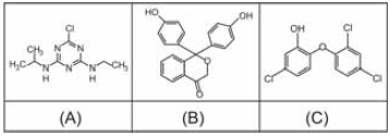 O crescimento das cidades e a expansão de novos processos industriais associados às mudanças climáticas tornaram mais difícil o tratamento de água doce para o abastecimento de água potável. As estações captam a água doce e realizam o tratamento químico convencional pela adição sequencial de sulfato de alumínio Al2(SO4)3, carbonato de sódio Na2CO3 e gás Cl2. Com a adição dessas substâncias, a água torna-se potável de acordo com a legislação atual. No entanto, pesquisas recentes apontam a presença de fenolftaleína e dos herbicidas triclosan e atrazina em amostras de água de torneira em capitais brasileiras. Essas substâncias não podem ser removidas por meio do tratamento químico convencional e a presença delas na água potável é resultado da presença de dejetos industriais, agrotóxicos e remédios em rios e reservatórios, sobretudo por conta do adensamento populacional. O triclosan é um antisséptico presente em enxaguatórios bucais em uma concentração de 0,3% (m/V). As estruturas moleculares da atrazina (A), da fenolftaleína (B) e do triclosan (C) são apresentadas a seguir.