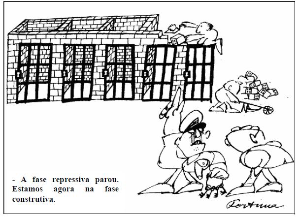 Leia o seguinte trabalho do chargista Fortuna, publicado na revista Pif Paf em julho de 1964.