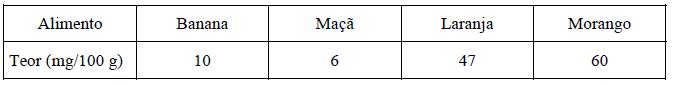 A tabela a seguir traz informação sobre o teor de vitamina C (mg de vitamina C/ 100g do alimento) em alguns alimentos: