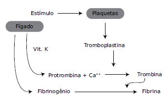 A formação de coágulos é um processo natural que impede a ocorrência de hemorragias, entretanto a coagulação no interior dos vasos obstrui a circulação sanguínea. O coágulo se forma devido à transformação de uma proteína denominada fibrinogênio em outra proteína em forma de uma rede de malhas finíssimas denominada fibrina, que estanca a hemorragia. Veja, no esquema abaixo, a sequência de reações simplificadas que levam à formação da fibrina e à consequente coagulação do sangue: