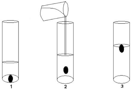 Ao adicionar um ovo de galinha a um recipiente contendo água, o ovo vai para o fundo. Em seguida, à medida que se coloca salmoura nesse recipiente, observa-se que o ovo flutua na superfície da solução obtida.