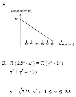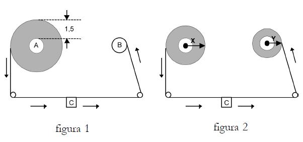 Observe a figura 1 que representa um leitor de áudio na posição de início de leitura.Os suportes circulares A e B têm 1 cm de raio e uma fita de 90 m está totalmente enrolada em A formando uma coroa circular de espessura 1,5 cm. A leitura da fita é feita pela peça C a uma velocidade constante. À medida que a fita passa, nos suportes A e B, formam-se duas coroas circulares com raios maiores x e y, respectivamente, como sugere a figura abaixo.