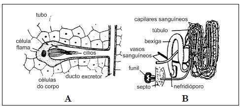 Observe os esquemas abaixo, em que A representa a célula flama de um platelminto e B, o nefrídio de um anelídeo.