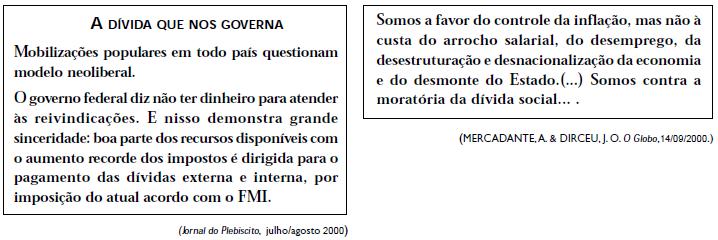 A questão tem como tema motivador a consulta popular sobre a dívida externa brasileira, realizada em setembro do ano 2000.