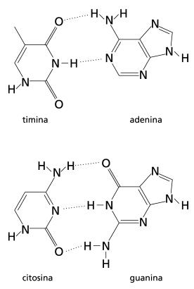 No esquema a seguir estão representadas, na forma de linhas pontilhadas, determinadas interações intermoleculares entre as bases nitrogenadas presentes na molécula de DNA - timina, adenina, citosina e guanina.