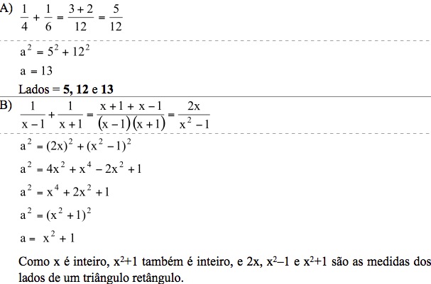 - calcula-se a soma de seus inversos, obtendo-se uma fração cujos numerador e denominador representam as medidas dos catetos de um triângulo retângulo;