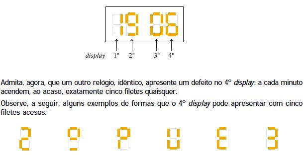 A maioria dos relógios digitais é formada por um conjunto de quatro displays, compostos por sete filetes luminosos. Para acender cada filete, é necessária uma corrente elétrica de 10 miliampères. O 1º e o 2º displays do relógio ilustrado abaixo indicam as horas, e o 3º e o 4º indicam os minutos.