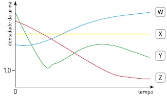 Considere que o ponto zero do gráfico corresponde ao instante a partir do qual uma pessoa deixe de repor a água perdida por seu organismo. A curva que registra as alterações da densidade da urina dessa pessoa, em função do tempo, é a identificada pela seguinte letra: