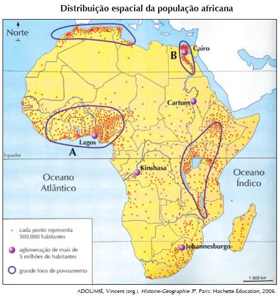Área A – Plantations ou agricultura tropical: devido à baixa produtividade, essa atividade demanda uma grande quantidade de mão-de-obra assalariada, resultando em grandes concentrações populacionais. Área B – Agricultura de várzea no vale do Nilo: o regime de cheias do rio e a fertilização sazonal dos