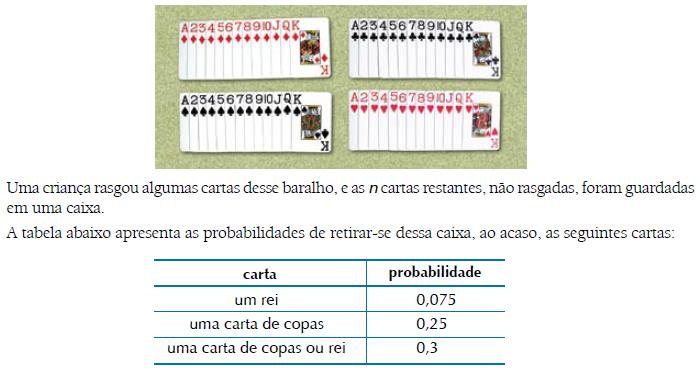 Os baralhos comuns são compostos de 52 cartas divididas em quatro naipes, denominados copas, espadas, paus e ouros, com treze cartas distintas de cada um deles. Observe a figura que mostra um desses baralhos, no qual as cartas representadas pelas letras A, J, Q e K são denominadas, respectivamente, ás, valete, dama e rei.