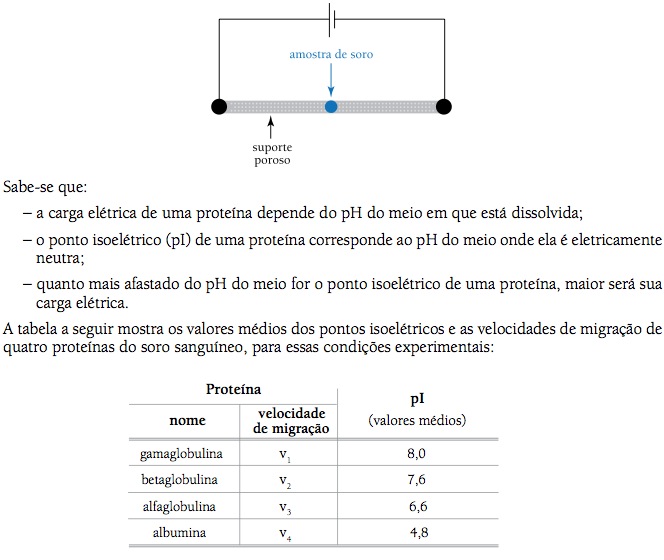 Em um experimento, uma pequena amostra de soro sanguíneo foi colocada em um suporte poroso embebido em meio formado por solução salina mantida em pH 6,0. Através desse suporte estabeleceu-se um circuito elétrico, como mostra o esquema abaixo.