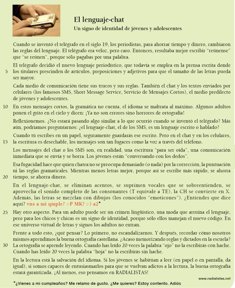 Para el autor, el lenguaje-chat puede ser visto como una frontera entre lo escrito y lo oral.