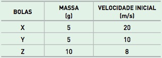 A tabela abaixo mostra as magnitudes das massas e das velocidades iniciais das bolas.