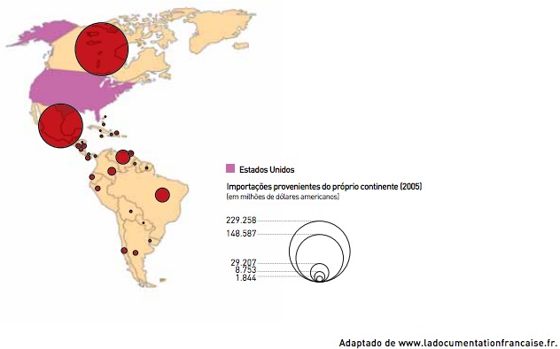 O comércio externo constitui um dos aspectos mais importantes da economia nacional em tempos de globalização. Observe, por exemplo, o mapa abaixo, que apresenta as importações dos E.U.A. provenientes do continente americano em 2005.