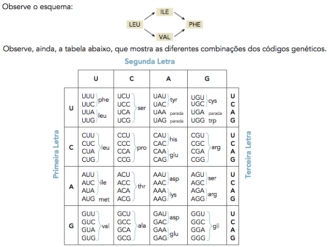 Uma cultura de células de mamífero foi incubada com um agente mutagênico e teve seu DNA alterado. As células mutantes produziram moléculas de RNA mensageiro cujas proteínas modificadas tinham os aminoácidos isoleucina (ILE) ou valina (VAL), em vez de leucina (LEU), em uma determinada posição. Quando essas células mutantes foram expostas a outro agente mutagênico, foi gerada uma proteína com fenilalanina (PHE) nessa mesma posição.
