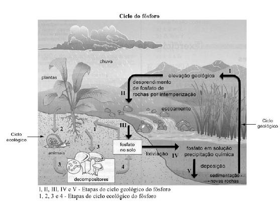 • identifique as etapas do ciclo geológico do fósforo em que as atividades antrópicas interferem diretamente, e indique as consequências do aumento das taxas de fotossíntese e de produtividade biológica decorrentes da descarga excessiva de fosfato, no ambiente aquático.