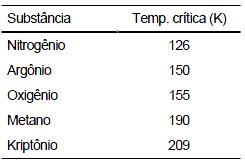 A tabela a seguir contém as temperaturas críticas para algumas substâncias.