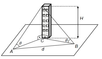 Dois observadores, situados nos pontos A e B, a uma distância d um do outro, como mostra a figura abaixo, avistam um mesmo ponto no topo de um prédio de altura H, sob um mesmo ângulo θ com a horizontal.