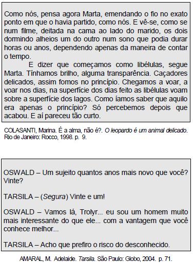 Os contextos a que esses fragmentos pertencem delineiam perfis femininos – a personagem Marta, do conto “É a alma, não é?”, de Marina Colasanti, e a protagonista Tarsila, da peça teatral homônima, de Maria Adelaide Amaral. Assim, a voz de Marta e de Tarsila, respectivamente,