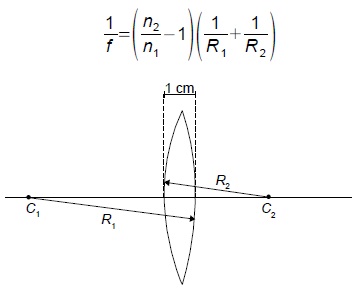 Considere uma lente de distância focal f =4 cm, com índice de refração n2=4/3 imersa no ar, e admita que a velocidade da luz no ar é igual à velocidade no vácuo. Se a espessura da lente é de 1 cm e a distância entre os centros (C1 e C2) é de 5 cm, determine os raios R1 e R2 . (5,0 pontos)