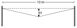 Dados experimentais indicam que a dilatação linear experimentada por um objeto material é proporcional ao seu comprimento inicial (L0) e à variação da temperatura a que é submetido (∆T), sendo que a constante de proporcionalidade, denominada de coeficiente de dilatação linear (∞), depende do material utilizado. Um fio de alumínio (∞=25x10−6 °C−1) de 10 m de comprimento está a uma temperatura de 20 °C, e é fixado pelas extremidades entre dois suportes, cuja distância é de 10 m. Um peso é colocado em seu ponto médio, de modo que o fio possa ser considerado reto entre o ponto médio e cada extremidade. Caso o fio seja aquecido, atingindo uma temperatura de 40 °C , ele sofrerá uma dilatação, de modo que o ponto médio estará a uma distância H da horizontal, como mostrado na figura. Nessa situação, qual é o valor de H em centímetros?