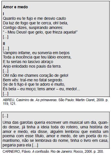 No trecho transcrito do romance A confissão, o protagonista remete a um poema de Casimiro de Abreu, o qual tematiza a relação amor e medo. Diante do desejo pela mulher amada, o que aproxima o eu lírico do poema e o protagonista do romance é a
