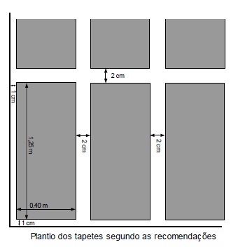 A grama-esmeralda é uma das mais difundidas no Brasil, usada para cobrir terrenos, jardins, campos de futebol etc. Em certa loja de jardinagem, essa grama é vendida em tapetes (ou placas) naturais retangulares, cada um com 0,40 m de largura por 1,25 m de comprimento, ao preço de R$ 1,50. Para o plantio, recomenda-se que cada tapete dessa grama seja colocado no terreno mantendo-se uma distância de 2 cm entre um tapete de grama e outro, em toda a volta do tapete. E, em relação às margens do terreno, recomenda-se que haja uma distância de 1 cm entre a placa e a margem, conforme a figura a seguir.
