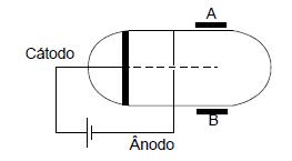 O esquema a seguir representa de modo simplificado o experimento de J. J. Thomson. Um feixe de partículas sai do cátodo, passa através de um orifício no ânodo e sofre a influência das placas metálicas A e B.