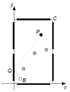 Para uma bola de bilhar com massa m, tem-se Ec(v) = mv2/2 e ER(v) = mv2/5. Considere que, ao rolar no tecido da mesa, a bola perde 0,08 J de energia por metro percorrido e, por isso, sua velocidade diminui gradativamente. A figura ao lado representa uma mesa de bilhar em um sistema de coordenadas cartesianas, tendo o metro como unidade de comprimento. A bola branca encontra-se no ponto B = (3/10,1/10), e a bola preta em P = (9/10,17/10). Todas as bolas estão inicialmente em repouso. Para levar a bola preta à caçapa em C = (3/2,5/2), a bola branca é lançada em direção a um ponto P ', imagem de P refletido em relação ao eixo y. Após uma colisão perfeitamente elástica com a lateral da mesa em um ponto Q, do eixo y, a bola branca segue em direção a C e colide frontalmente com a bola preta, transferindo a ela 2/3 de sua energia. Nessas condições,