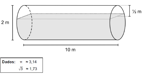 Um posto de gasolina possui um reservatório cilíndrico horizontal com dimensões internas de 2 metros de diâmetro por 10 metros de comprimento. O posto iniciou as vendas do dia com o reservatório cheio de gasolina. Após uma hora, verificou-se que o nível de gasolina no reservatório havia baixado meio metro, como representado na figura a seguir.