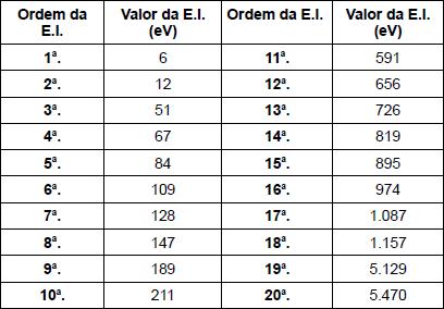 A energia necessária para que seja formado um íon pela remoção de elétrons é denominada energia de ionização (E.I.). A tabela a seguir apresenta os valores de todas as energias de ionização do cálcio.