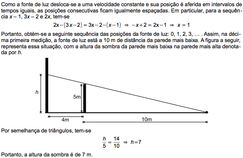 Considere duas paredes paralelas, com distância de 4 m entre si e alturas de 10 m e 5 m. Uma fonte de luz puntiforme encontra-se na base da parede mais baixa e começa a deslocar-se horizontalmente no sentido oposto à parede mais alta, com velocidade constante. São realizadas medições consecutivas, em intervalos de tempo iguais, da distância da fonte de luz até a base da parede mais baixa, obtendo-se uma sequência, cujos três primeiros valores são: x – 1, 3x – 2 e 2x. Sabendo-se que são realizadas 11 medições, determine a altura da sombra da parede mais baixa na parede mais alta, projetada pela fonte de luz, no instante da décima primeira medição.