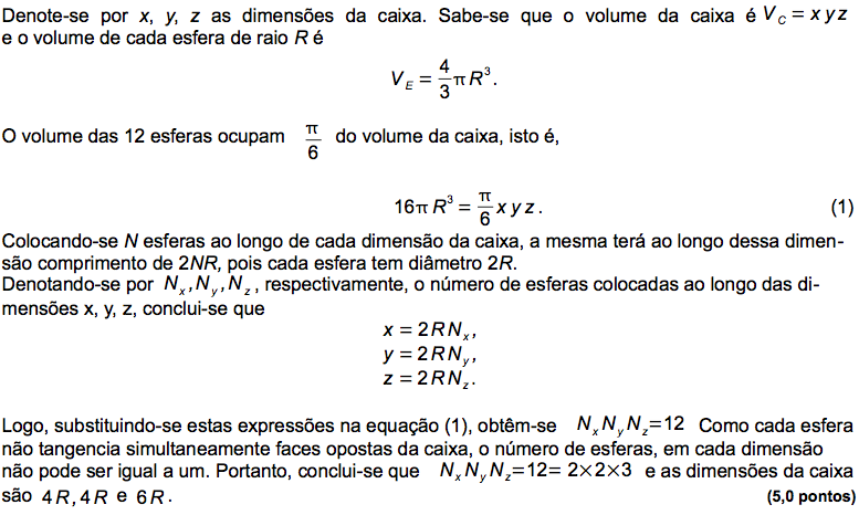 Deseja-se transportar 12 bolas de boliche esféricas de mesmo raio R em uma caixa em forma de paralelepípedo reto retângulo, de modo que as bolas fiquem tangentes entre si, e aquelas situadas na extremidade de uma mesma fileira tangenciem as faces da caixa. Além disso, nenhuma bola tangencia faces opostas da caixa. Lembre-se de que a caixa terá de ser tampada. Sabendo que o volume das bolas ocupa /6 do volume da caixa, determine, em função de R, as dimensões da caixa.