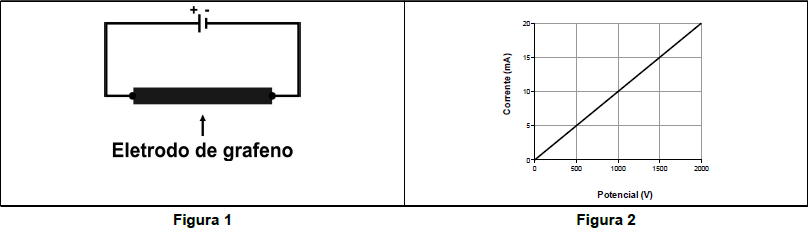 O grafeno é formado por camadas unidimensionais de átomos de carbono densamente compactados em um arranjo hexagonal. Esse material apresenta alta condutividade elétrica, característica que o qualifica como ideal para substituir o sílicio na indústria de semicondutores. Em um experimento, um eletrodo de grafeno foi submetido à aplicação de um potencial elétrico e a corrente elétrica gerada foi monitorada, conforme ilustrações que seguem