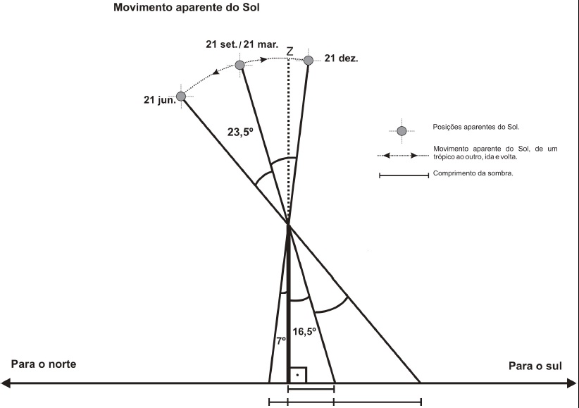 Na figura, um relógio de sol vertical está localizado em Goiânia (latitude 16° 30' Sul). O marcador do relógio está representado pela barra vertical. Quando iluminado pelo Sol, ao longo do ano, o relógio projeta sombras ao meio-dia (representadas na figura). Visto a partir das localidades intertropicais, o Sol passa (movimento aparente) duas vezes pelo zênite, o ponto mais alto do céu (Z). Considerando-se a figura e que, em uma situação ideal, o deslocamento do Sol seja uniforme, conclui-se que os meses, aproximadamente, nos quais o Sol passará duas vezes pelo zênite de Goiânia, serão