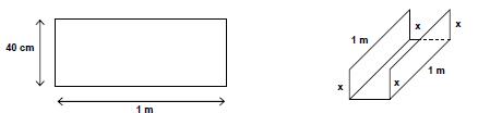 Uma calha será construída a partir de folhas metálicas em formato retangular, cada uma medindo 1 m por 40 cm. Fazendo-se duas dobras de largura x, paralelas ao lado maior de uma dessas folhas, obtém-se três faces de um bloco retangular, como mostra a figura da direita.