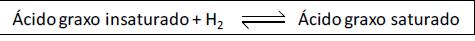 As moléculas de triacilglicerol são diferenciadas em função das cadeias carbônicas oriundas dos ácidos graxos que sofreram condensação por esterificação com os grupos álcool da molécula de glicerol (propano-1,2,3-triol). Os principais ácidos graxos apresentam cadeias não ramificadas e número par de átomos de carbono, podendo ser saturados ou insaturados. Em função da presença de uma insaturação entre átomos de carbono, tem-se a possibilidade de ocorrência dos dois isômeros geométricos: cis e trans. O isômero trans é mais estável que o cis. A principal fonte de ácidos graxos trans é a hidrogenação parcial de óleos vegetais (triacilglicerol) usados na produção de margarina e gordura hidrogenada, conforme a equação de equilíbrio indicada abaixo. O mecanismo da reação envolve a adição da molécula de hidrogênio à dupla ligação, mediada pelo catalisador, e formação de uma ligação saturada entre átomos de carbono.
