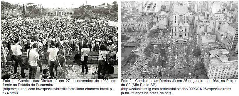 As fotos acima retratam alguns dos vários comícios pelas Diretas Já que ocorreram no Brasil, entre 1983 e 1984, reivindicando eleições diretas para presidente. A partir desses documentos e de seus conhecimentos históricos sobre o assunto, disserte sobre quem se engajou nesse movimento e quais as consequências das Diretas Já para a política brasileira.