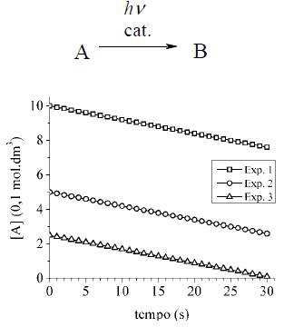Numa sequência de três experimentos, a concentração inicial de A foi variada de 1,0 a 0,25 mol.dm-3, mantendo-se a mesma quantidade de catalisador e a mesma potência da fonte de luz ultravioleta. O gráfico ao lado corresponde ao monitoramento da concentração de A nos três experimentos em função do tempo.