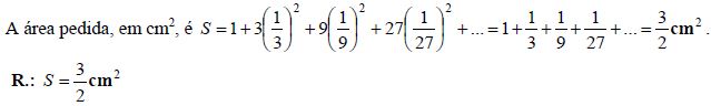 A região fractal F, construída a partir de um quadrado de lado 1cm, é constituída por uma infinidade de quadrados e construída em uma infinidade de etapas. A cada nova etapa consideram-se os quadrados de menor lado (l ) acrescentados na etapa anterior e acrescentam-se, para cada um destes, três novos quadrados de lado l /3. As três primeiras etapas de construção de F são apresentadas a seguir.