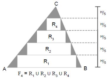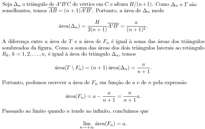 Considere o triângulo T, de vértices A, B e C, tal que os ângulos  e B são agudos. Seja H a altura relativa ao lado AB. Para cada número natural n, seja Fn a figura formada pela união de n retângulos justapostos contidos em T (veja na figura o caso n = 4). Cada retângulo tem dois lados perpendiculares a AB medindo H/(n+1) e um lado ligando AC a BC (o maior dos retângulos tem um lado contido em AB).